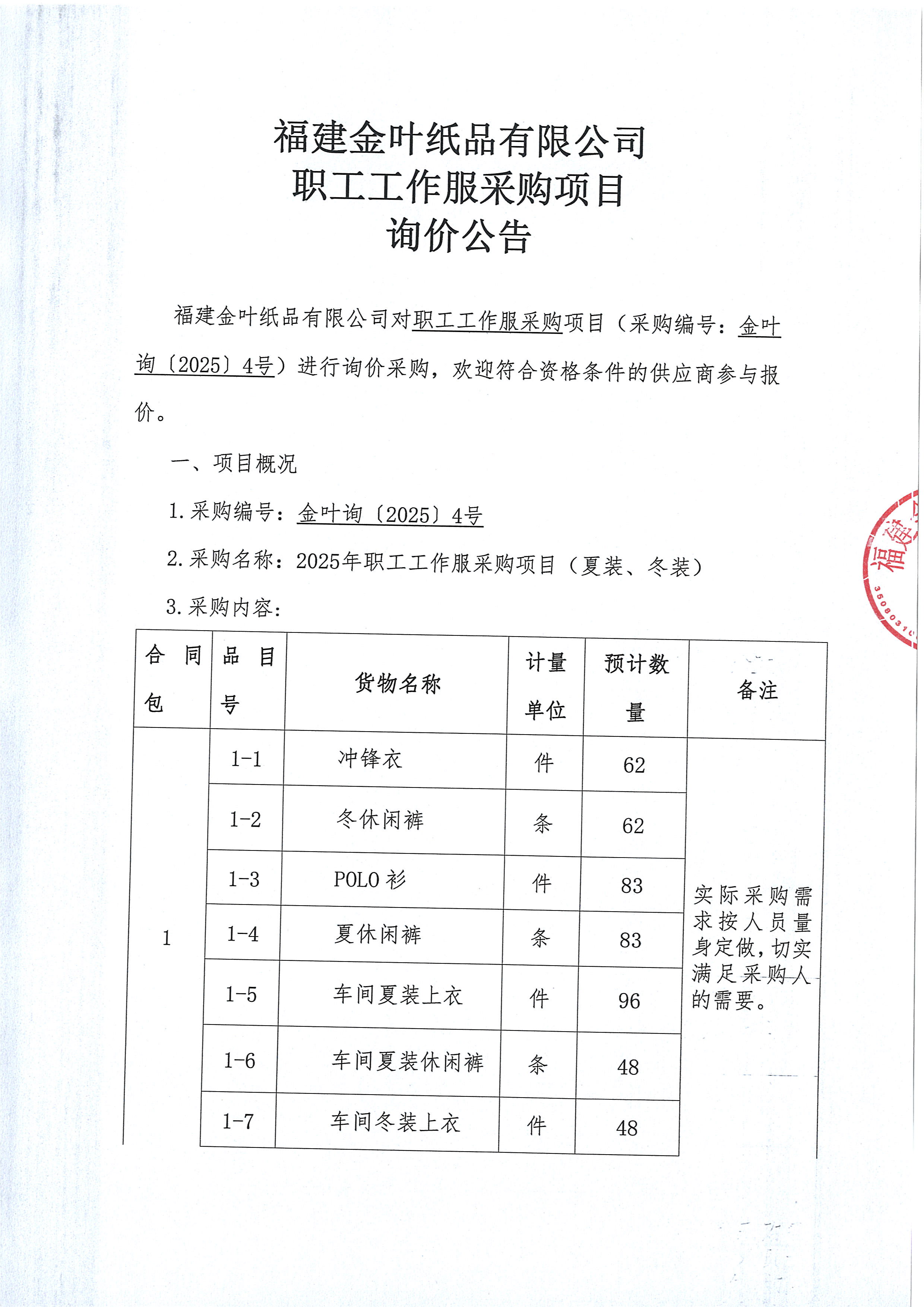 职工工作服询价项目