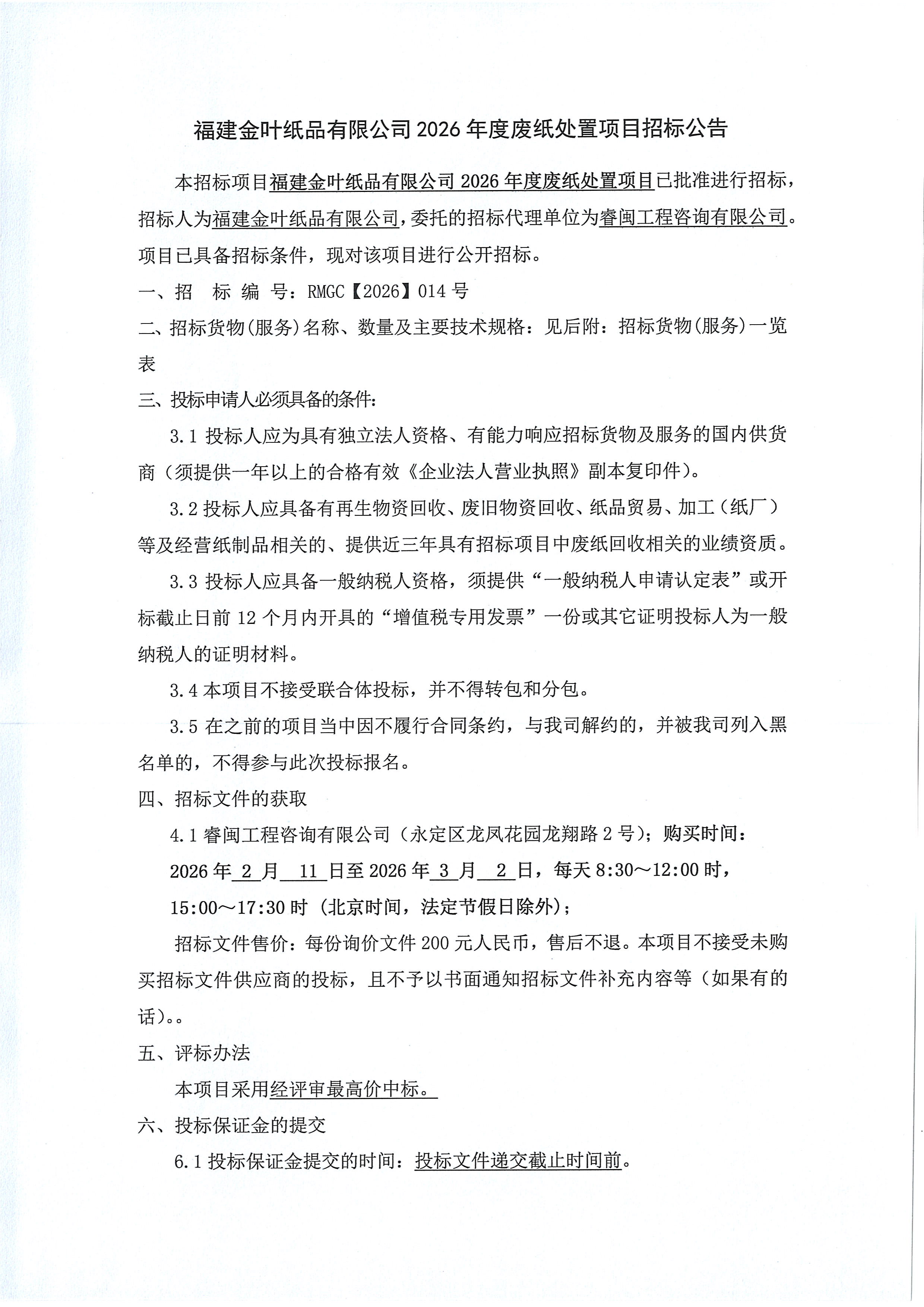 2026年度废纸处置项目