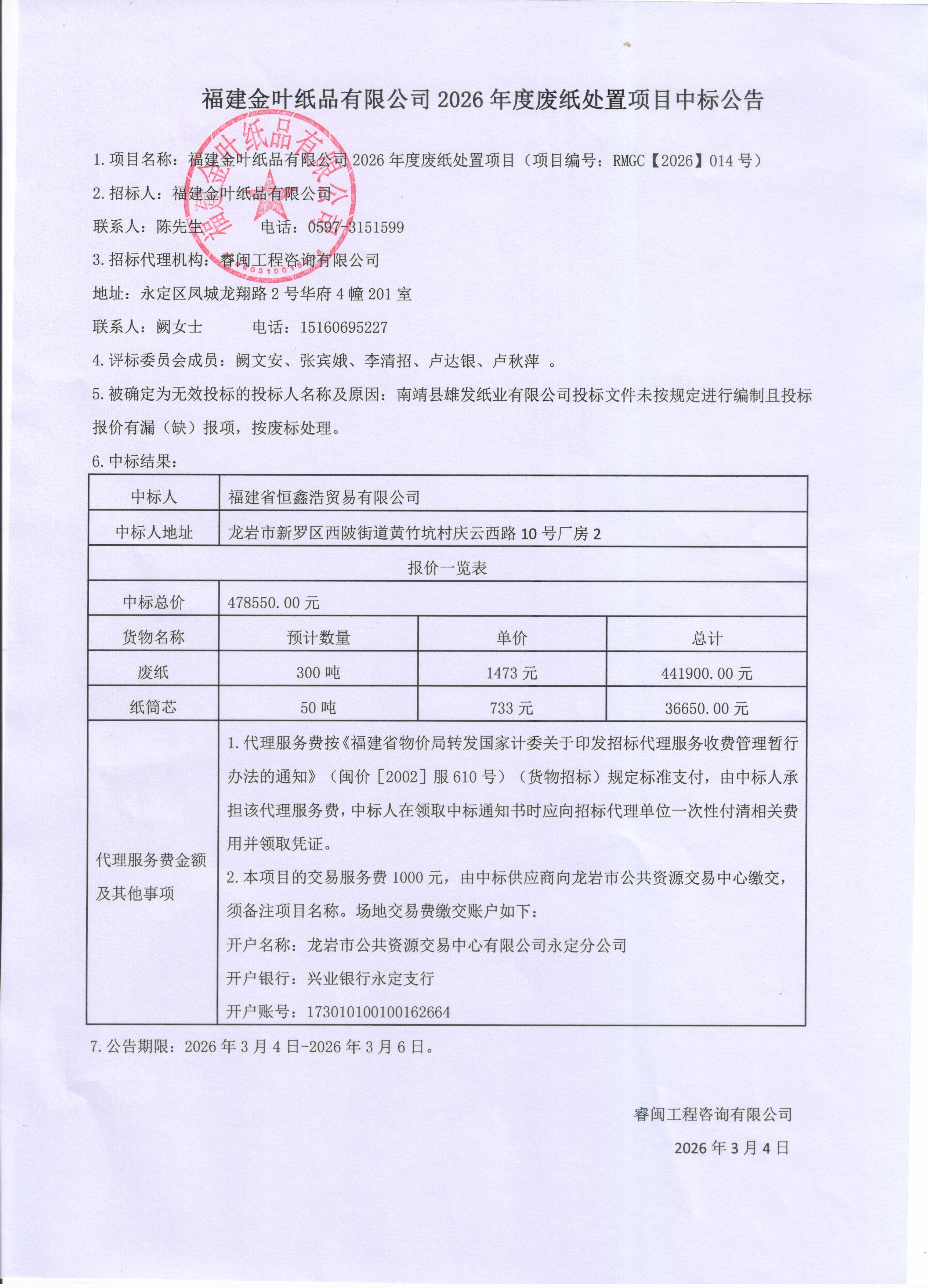 2026年度废纸处置项目中标公告