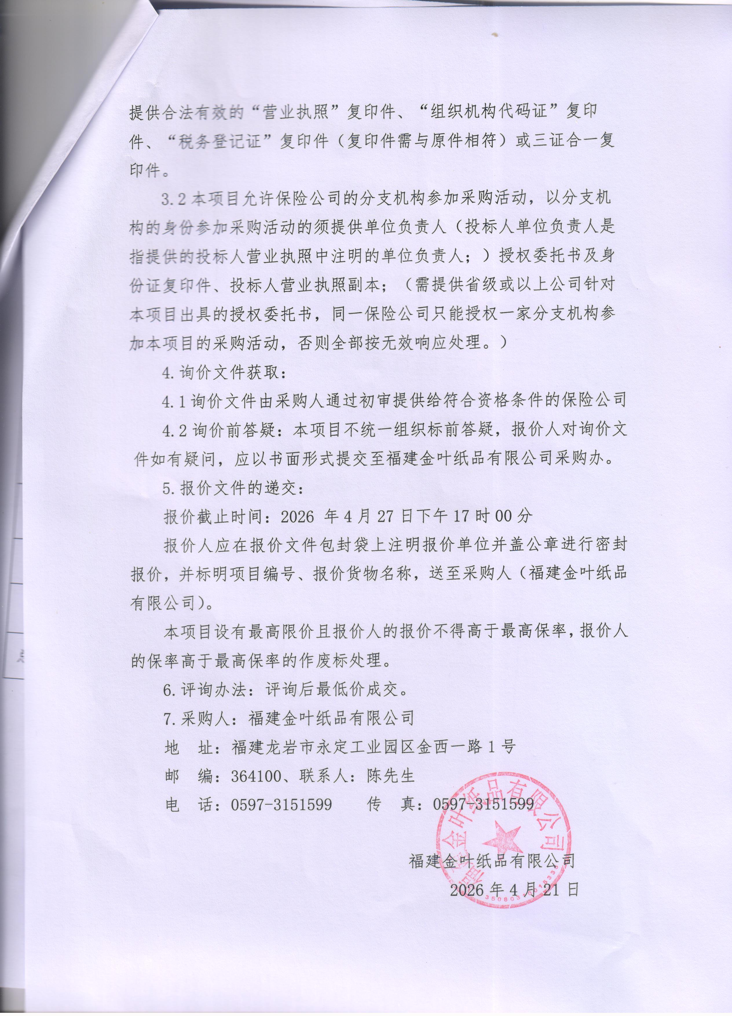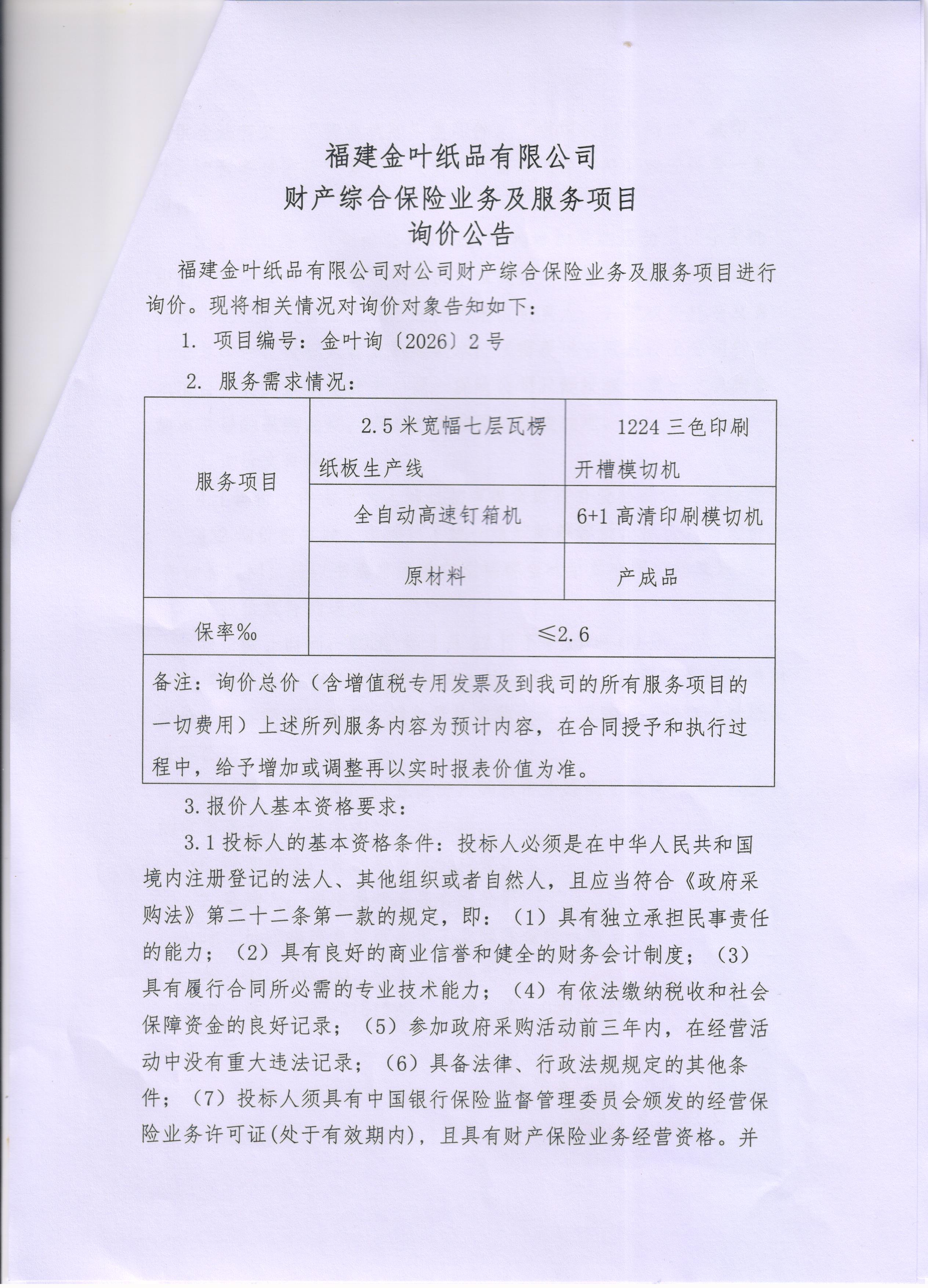 财产综合险保险业务及服务项目询价公告